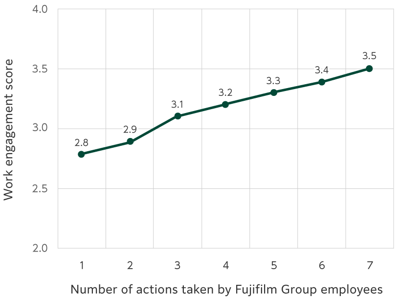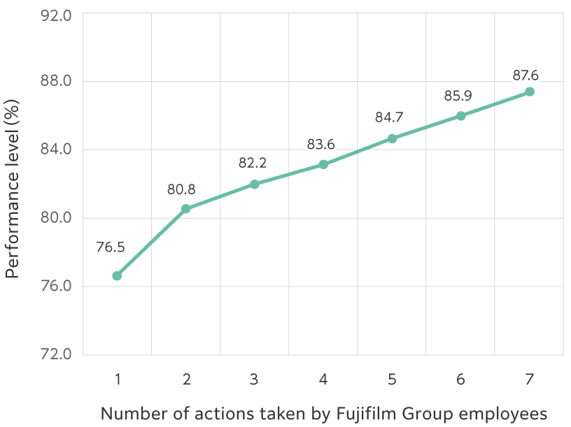 We found that there is positive correlation between the number of actions actually taken from the Seven Actions for Good Health, and the level of performance*1 and work engagement*2. We recommend employees to put these actions into practice.